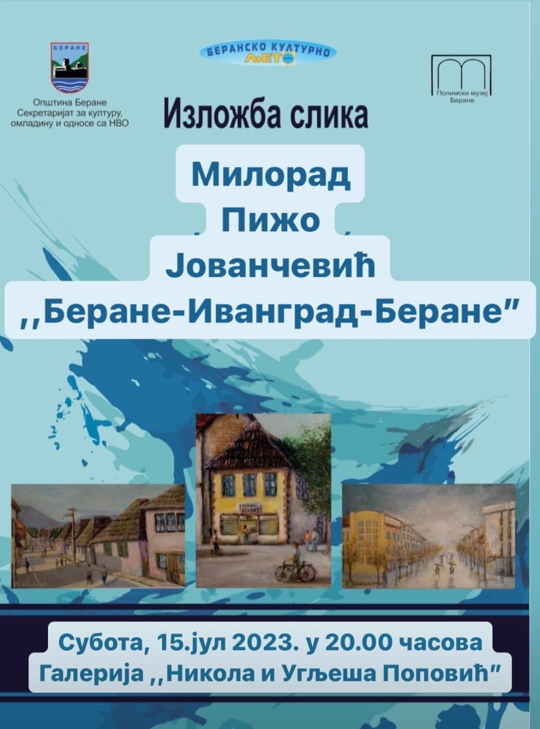 U subotu, 15. jula, u 20 časova, u galeriji ,,Nikola i Uglješa Popović“, biće otvorena izložba slika pod nazivom ,,Berane – Ivangrad – Berane“, autora Milorada – Piža Jovančevića, u organizaciji Sekretarijata za kulturu, omladinu i odnose sa NVO i JU ,,Polimski muzej“. Jovančević na svojim slikama prikazuje Berane u rasponu od jednog vijeka i postepenu tranformaciju kroz vrijeme. Ovo je njegova prva samostalna izložba.