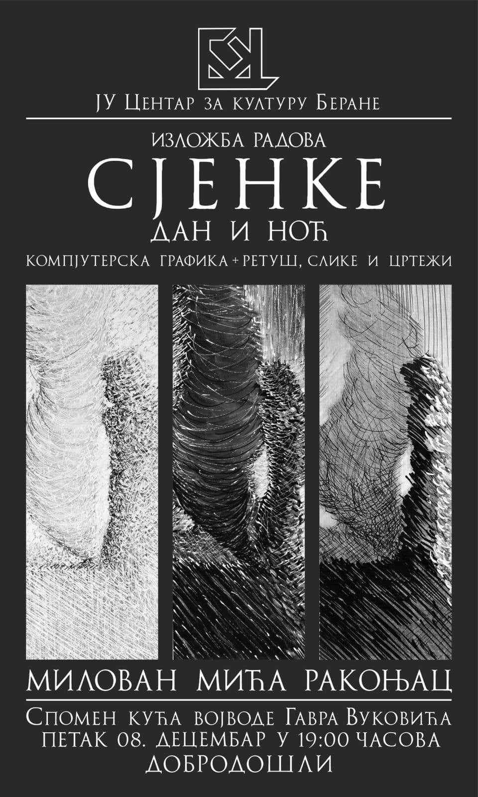 U Spomen kući vojvode Gavra Vukovića u petak, 08. decembra 2023. godine, sa početkom u 19 časova, biće otvorena izložba pod nazivom “Sjenke-dan i noć” Milovana – Miće Rakonjca. U pitanju je kompjuterska grafika, retuš slika i crteža.