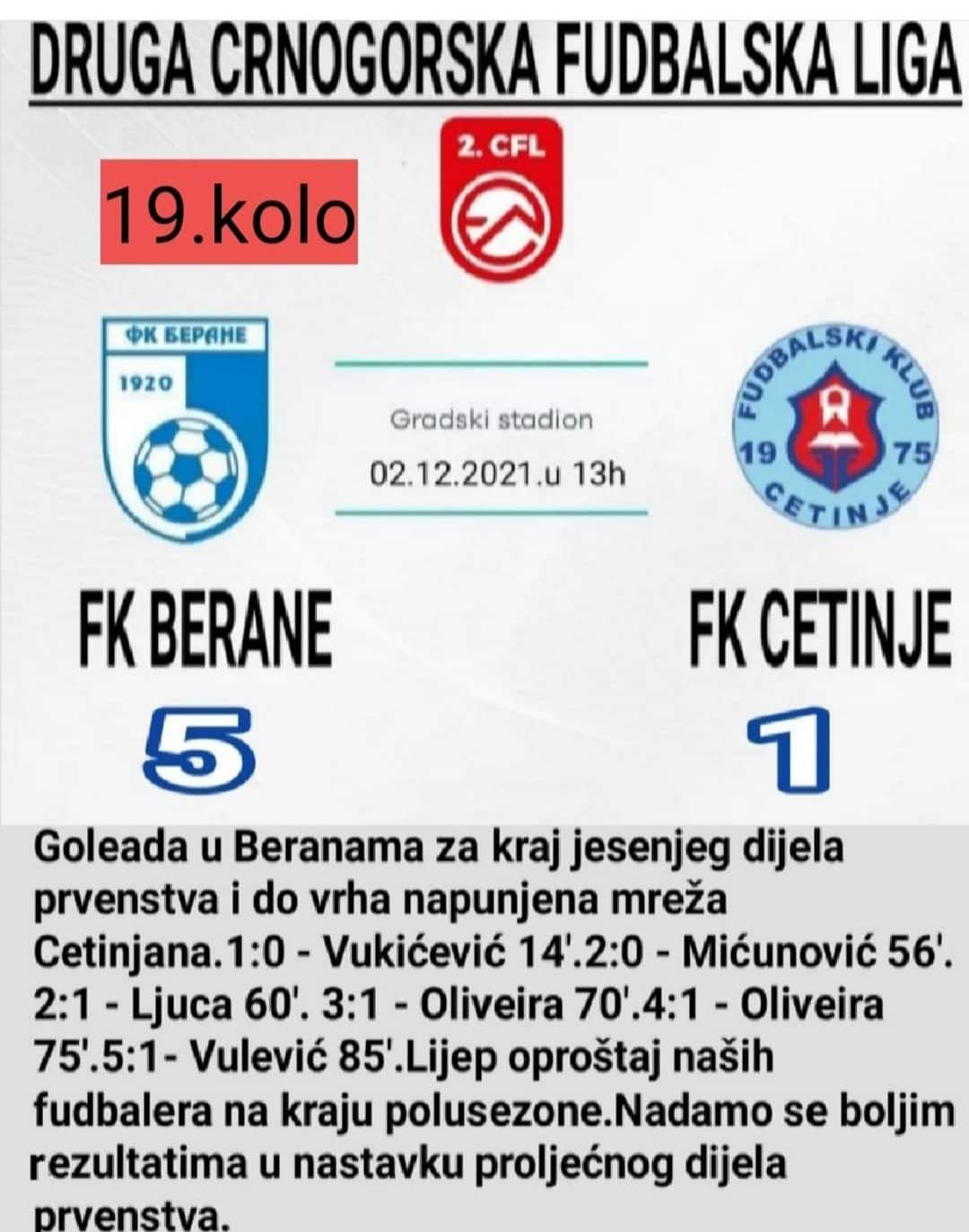 Ubjedljivom pobjedom nad ekipom Cetinja, fudbaleri Berana su osvojili nova tri boda. Oni su na svom terenu “izrešetali” mrežu gostiju i sa 5: 1 ostvarili najubjedljiviju pobjedu u 19. kolu Druge lige Crne Gore.