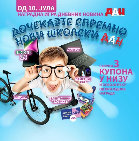 Izvlačenje nagrada u nagradnoj igri Dana “Dočekajte spremno novi školski dan” obavljeno je28. avgusta. Poznato je svih 55 najsrećnijih, 50 dobitnika vaučera za školski pribor u vrijednosti od 30 € i 5 dobitnika glavnih nagrada – telefona iPhone 14, električnog trotineta, bicikla, laptop računara i pametnog sata.