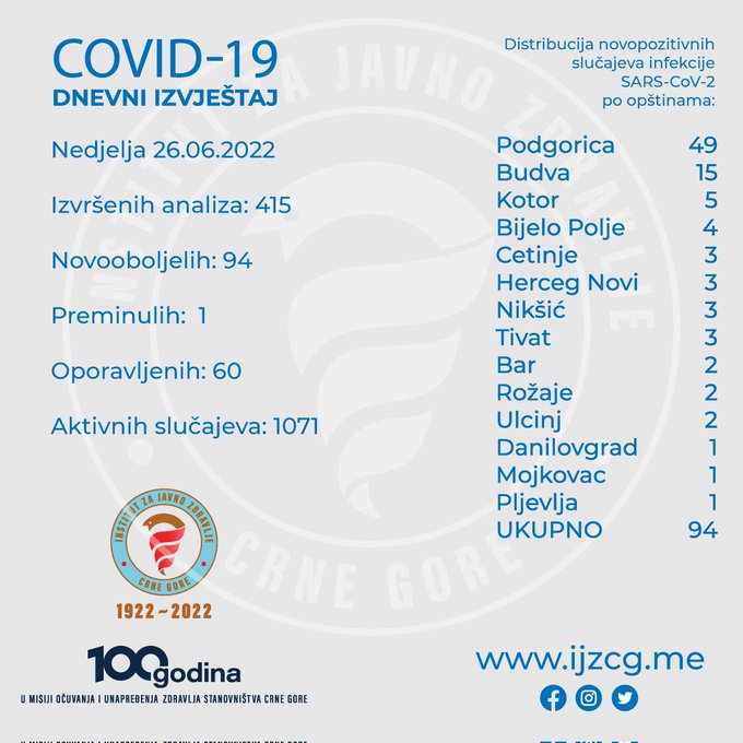 U Crnoj Gori je, u posljednja 24 sata, od posljedica infekcije koronavirusa preminula jedna osoba, a registrovana su 94 nova slučaja, saopšteno je iz Instituta za javno zdravlje (IJZ).