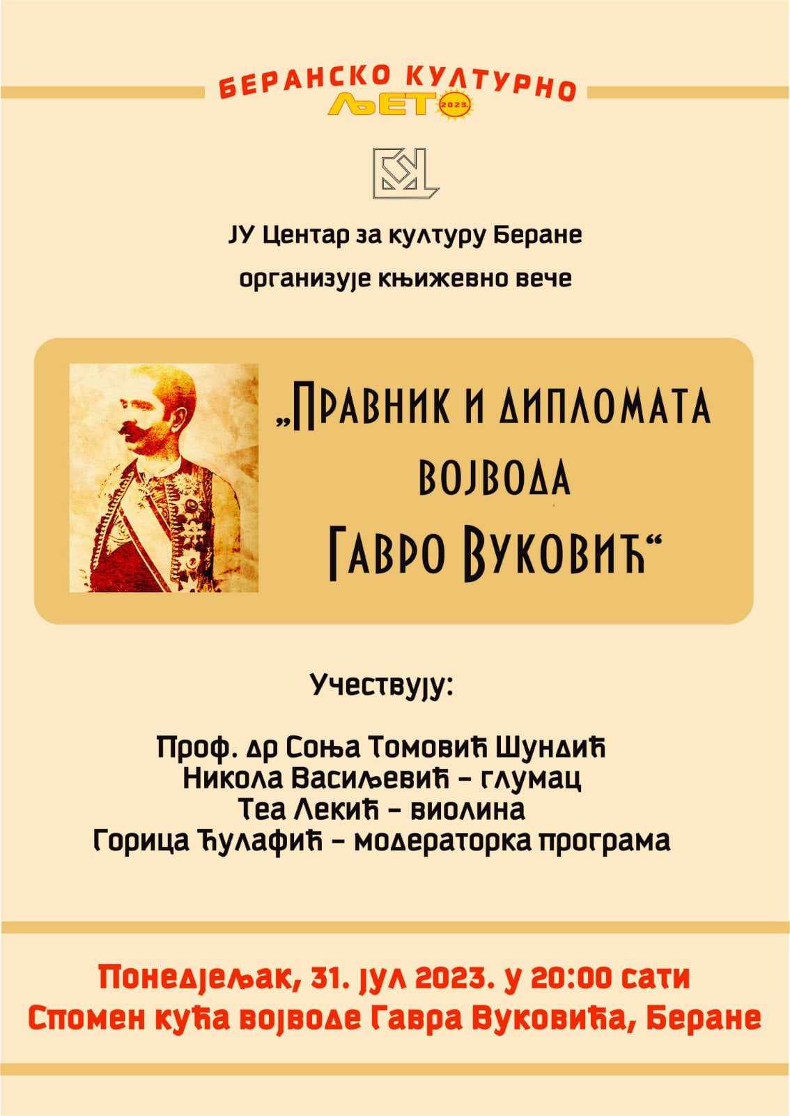 U okviru manifestacije „Beransko kulturno ljeto 2023“ u ponedeljak, 31. 07. 2023. g. u 20 časova u Spomen kući vojvode Gavra Vukovića, biće upriličeno književno veče pod nazivom „Pravnik i diplomata vojvoda Gavro Vuković“, u organizaciji JU Centar za kulturu Berane.