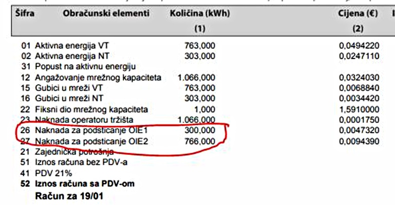 Na osnovu Uredbe o naknadi za podsticanje proizvodnje električne energije iz obnovljivih izvora (OIE) i visokoefikasne kogeneracije od januara ove godine na računima za struju umjesto stavke naknada za podsticanje OIE uvedena su dva obračunska elementa – naknada za podsticanje OIE1 I Naknada za podsticanje OIE2, prenosi CDM.