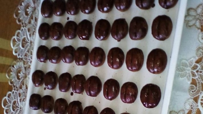 Kad se smjesa ohladi, oblikovati male kuglice i u svaku utisnuti čačkalicom otisak po sredini, da se dobije oblik zrna kafe.