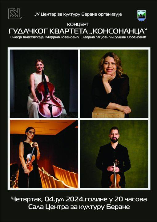 Koncert gudačkog kvarteta “Konsonanca” organizovaće se u Centru za kulturu u Beranama 04. jula sa početkom od 20 časova.