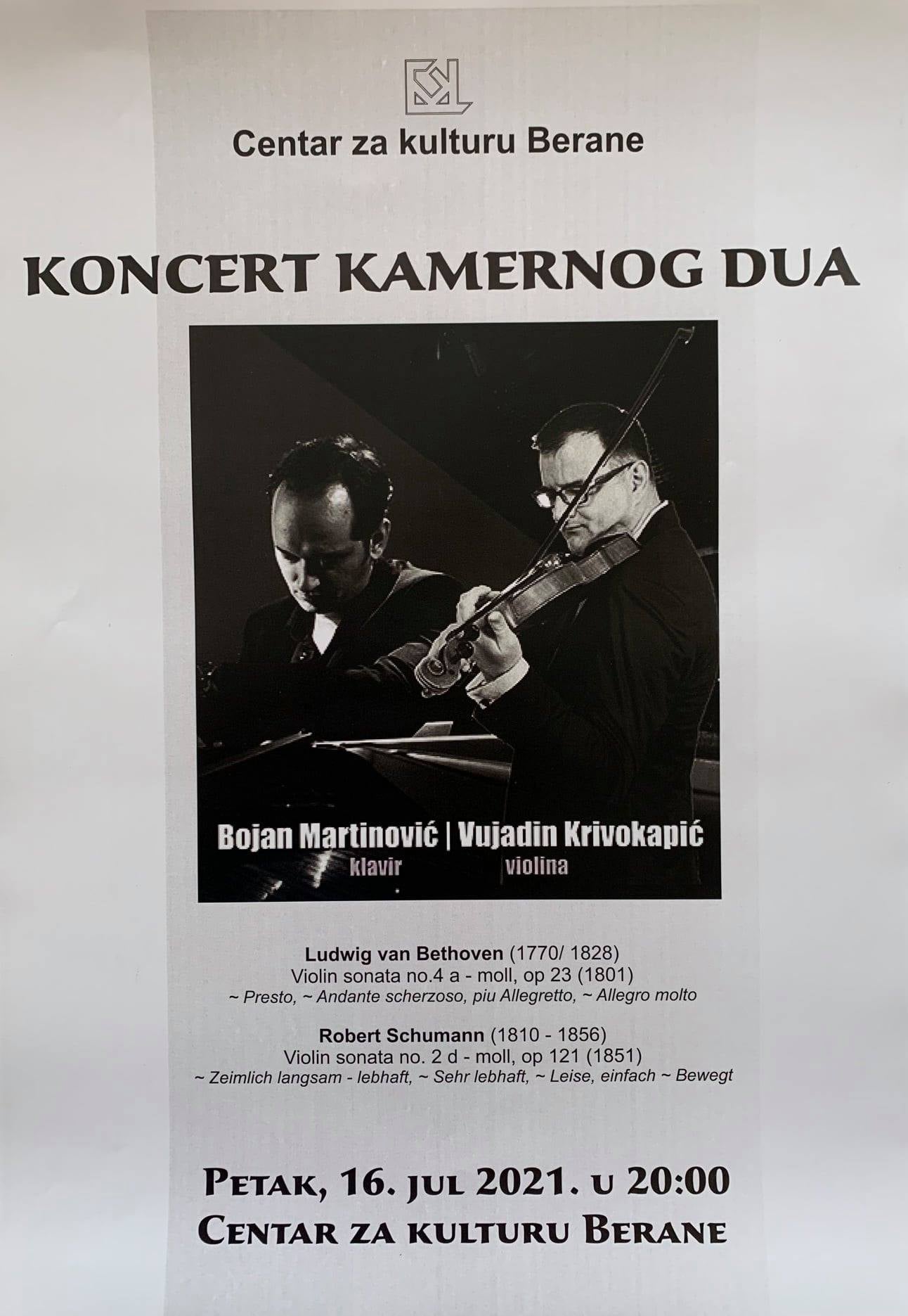 Koncert eminentnog crnogorskog kamernog dua – Bojana Martinovića (klavir) i Vujadina Krivokapića (violina) na programu Beranskog kulturnog ljeta je u petak 16. jula 2021. godine od 20 časova u Centru za kulturu u Beranama.