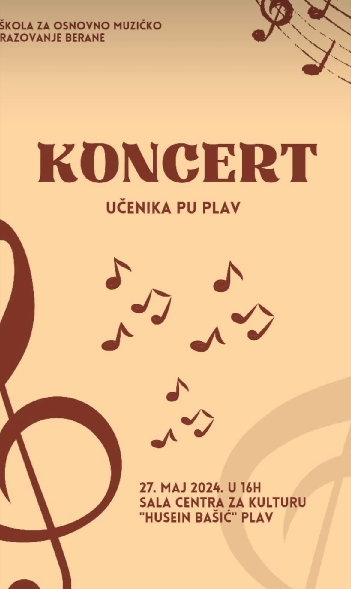 Koncert učenika PU Plav održaće se 27. maja 2024. godine u 16 sati u sali Centra za kulturu “Husein Bašić” u Plavu.