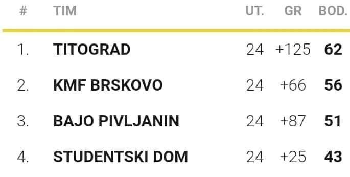 KMF Titograd, KMF Brskovo, KMF Bajo Pivljanin i KMF Studentski dom. Parovi polufinala, koje se inače igra na dva meča na gol razliku u kojima može odlucivati i gol u gostima, su: