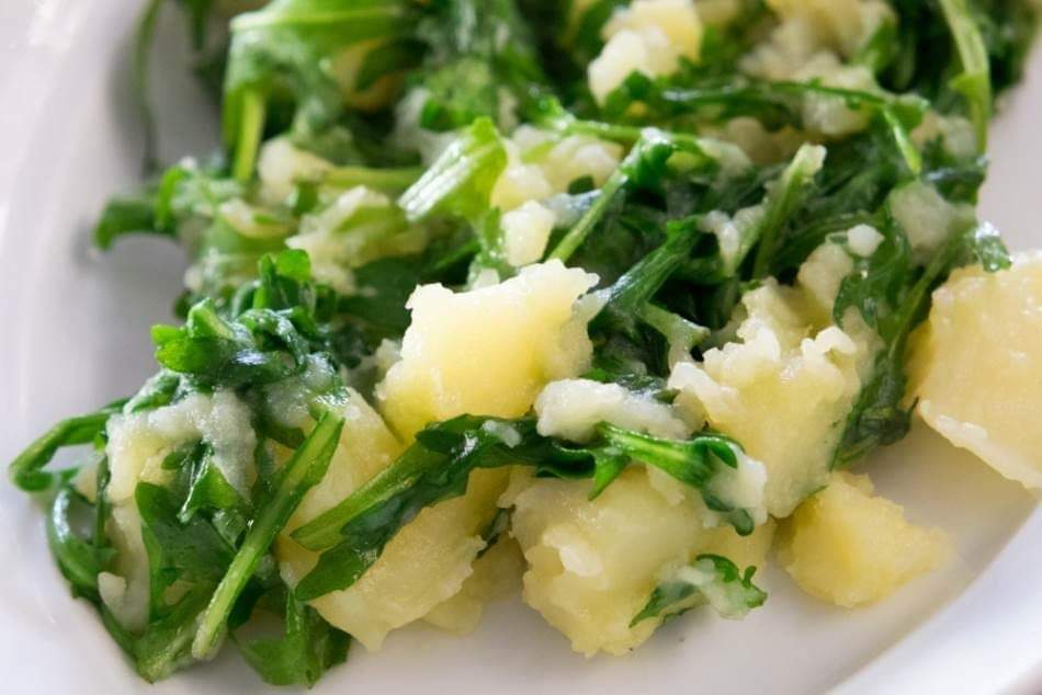 Krompir obarite, kao i blitvu. Isecite po želji, pa dodajte začine i seckan beli luk. Nauljite, promešajte i ohladite.