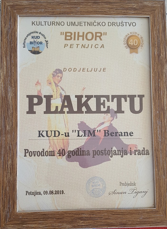 Povodom 40 godina od osnivanja Kulturno umjetničkog društva “Bihor” iz Petnjice, KUD “Lim” su bili gosti na koncertu i dobili Plaketu kao dokaz dobre i uspješne saradnje između naša dva društva.
