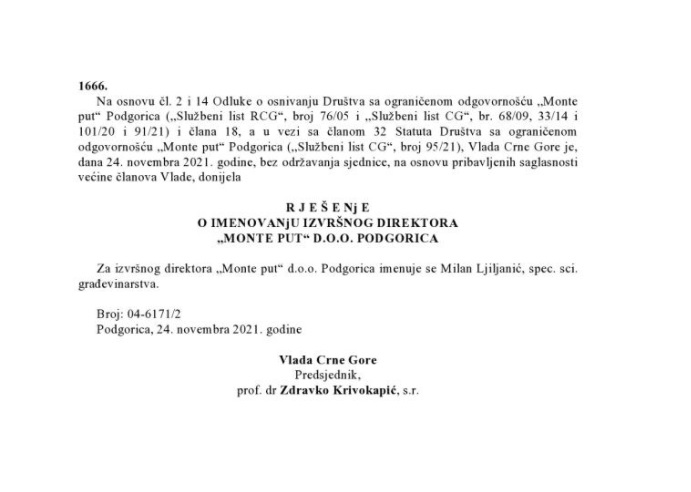 Vršilac dužnosti direktora državnog preduzeća Monteput od danas je Milan Ljiljanić, potvrđeno je Portalu RTCG. On na toj funkciji mijenja Jonuza Mujevića. Odluka Vlade o imenovanju Ljiljanića objavljena je u Službenom listu.