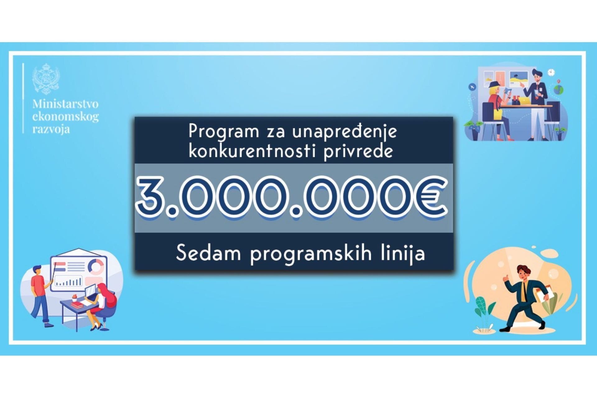 Program za unapređenje konkurentnosti privrede za ovu godinu, u iznosu od tri miliona EUR, sadrži set programskih linija finansijske i nefinansijske podrške, čija realizacija treba da doprinese bržem oporavku i pokretanju privredne aktivnosti preduzetnika i privrednih društava u cilju daljeg napretka i ubrzanja ekonomskog razvoja shodno prioritetima Vlade. Javni poziv za učešće u postupku dodjele sredstava za Program koji je raspisalo Ministarstvo ekonomskog razvoja 2. avgusta je u toku.