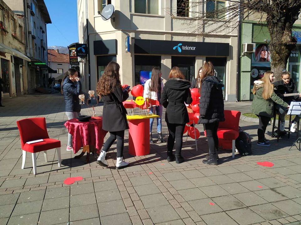 Ana Boričić, Sandra Đukić i Magdalena Trifunović, pripadnice benda “ALT” i “Zapremina kruga”, su uz zvuk gitare i dobar glas privlačile prolaznike u glavnoj ulici, a uz sunce vladala je pozitivna atmosfera u znaku ljubavi. Pomoću balona, šešira i izazova su izabrani srećni dobitnici koji su za Dan zaljubljenih osvojili tri nagrade, dvije večere za dvoje i piće za dvoje.