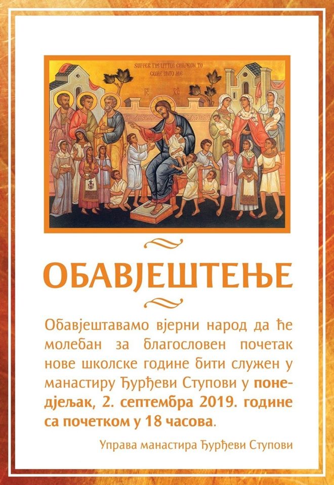Obavještava se vjerni narod da će moleban za blagosloven početak nove školske godine biti služen u manastiru Đurđevi Stupovi danas, sa početkom u 18 časova, saopšteno je iz uprave manastira Đurđevi Stupovi. Post navigation Završen Sea Dance, Geta oduševio publiku Predsjednik opštine podijelio udžbenike đacima prvacima