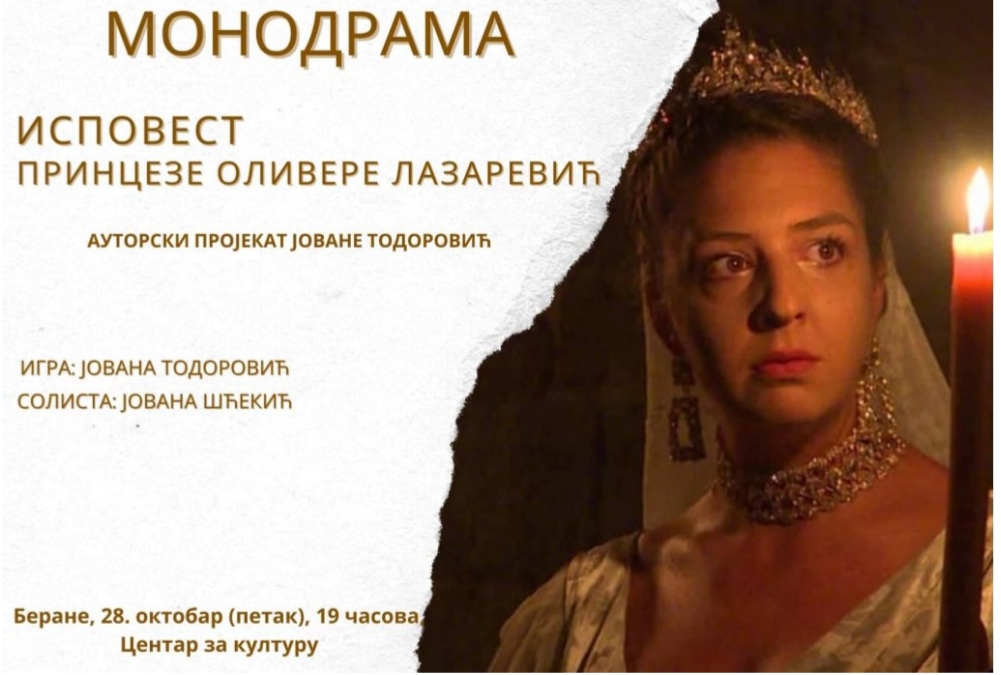 Monodrama „Ispovest princeze Olivere Lazarević“ biće izvedena na sceni Centra za kulturu u petak, 28. oktobra 2022. godine u 19 časova. Ovo je autorski projekat Jovane Todorović koji je uradila kao istraživanje za svoj doktorski rad.
