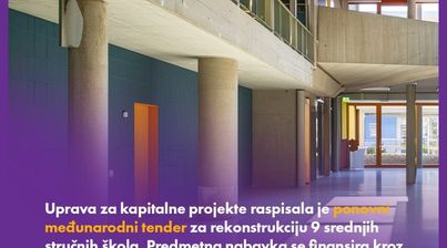 Ministarstvo prosvjete, nauke i inovacija u saradnji sa Upravom za kapitalne projekte, raspisala je ponovni međunarodni tender za rekonstrukciju devet srednjih stručnih škola.