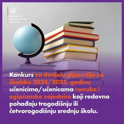 Ministarstvo prosvjete, nauke i inovacija raspisalo je konkurs za dodjelu stipendija učenicima/učenicama romske i egipćanske zajednice koji redovno pohađaju trogodišnju ili četvorogodišnju srednju školu.