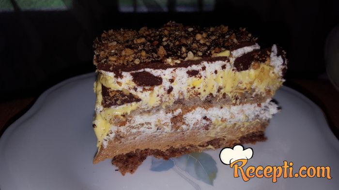 - Za koru umutiti 7 bjelanaca, dodati 7 kašika šećera i mutiti mikserom dok se ne umuti u čvrst šne. Zatim dodati lješnike i brašno i polako kašikom izmiješati. Peći 15-20 minuta na 180°C. Peći 2 kore.