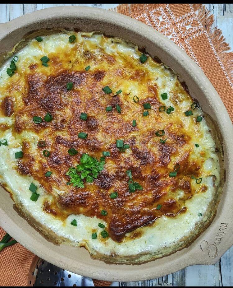 Krompir isijecite na krupnije kocke i skuvajte. Krem supu skuvajte sa vodom i mlijekom i dodajte joj pavlaku. Pripremite zemljanu posudu i na dno posude stavite kuvani krompir, rendanu šargarepu pa kidajte manje parčiće roštilj mesa i ređajte svuda ravnomjerno, luk i 100gr rendanog kačkavalja. Prelijte sve krem supom i pospite ostatkom kačkavalja. Posolite i pobiberite. Pecite u zagrijanoj rerni na 180 stepeni oko 30-40min.