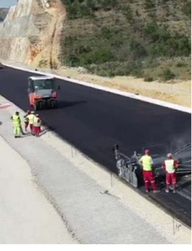 Nakon postavljanja prvog bitumiziranog nosećeg sloja asfalta na 500 metara dionice autoputa ugrađeno je 950 asfaltnog zastora, piše RTCG.