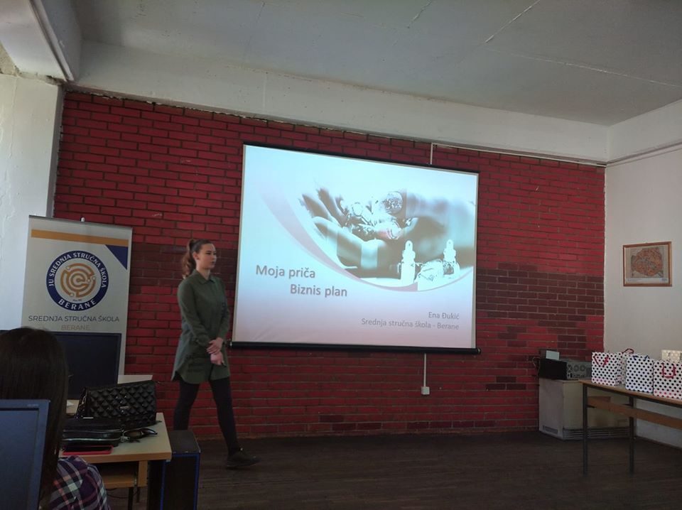 Četvrto mjesto osvojila je učenica Srednje stručne škole Berane Ena Đukić za svoj biznis plan kojim će doprinijeti porodičnom poslu i salonu ljepote, a ujedno i stvoriti svoj biznis kao kozmetičarka.