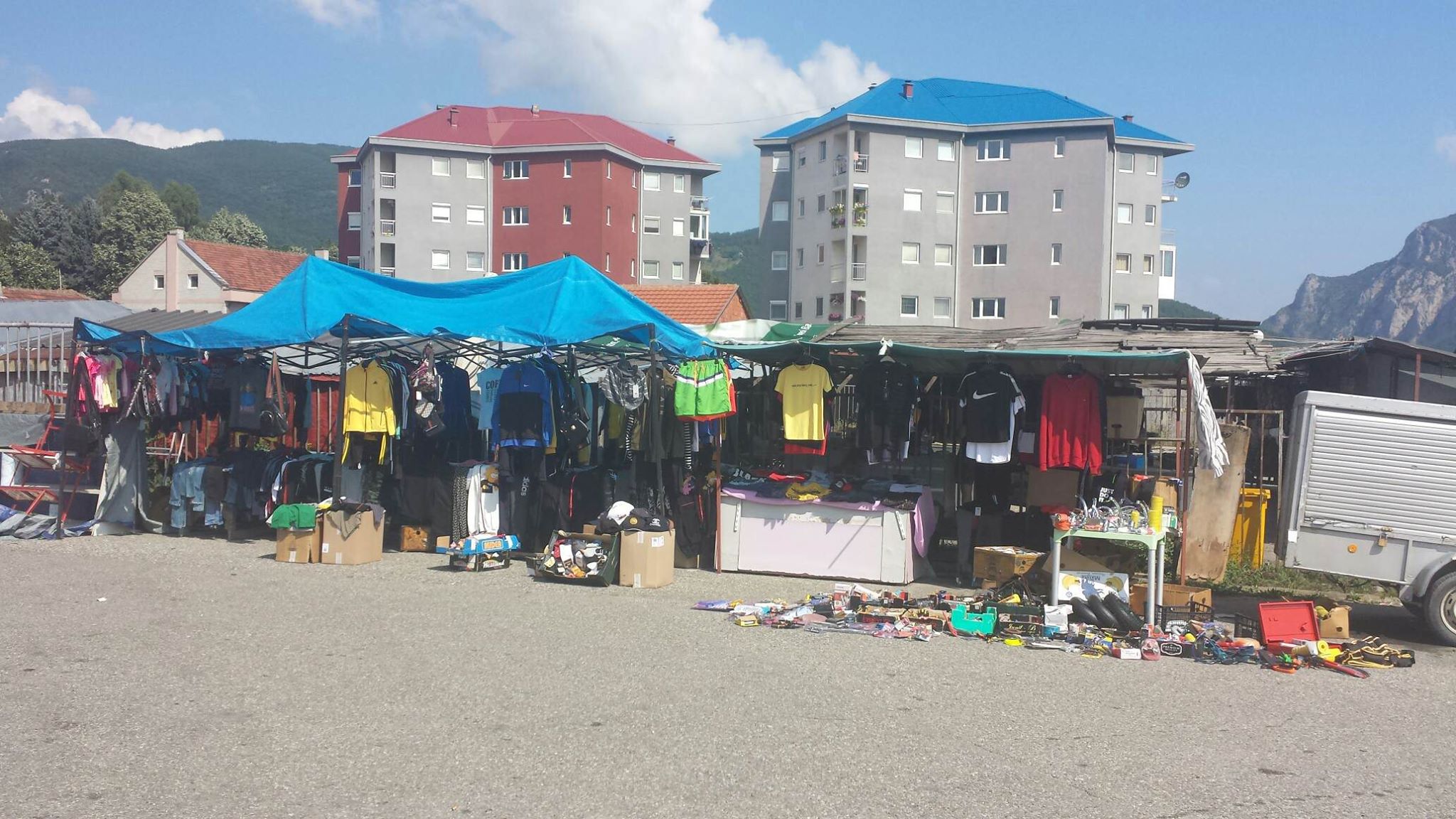 Kupci znatiželjno obilaze tezge na kojima se jedni do drugih ređaju odjeća, obuća, automobilske gume, umjetnički predmeti, reketi za tenis, stari časopisi i knjige. Poseban dio je tehnička roba gdje se prodaju polovni mobilni telefoni, kompjuteri, muzičke linije, kućni aparati. Ima i svega što je potrebno za automobil – novo i polovno, pa kako kome odgovara.