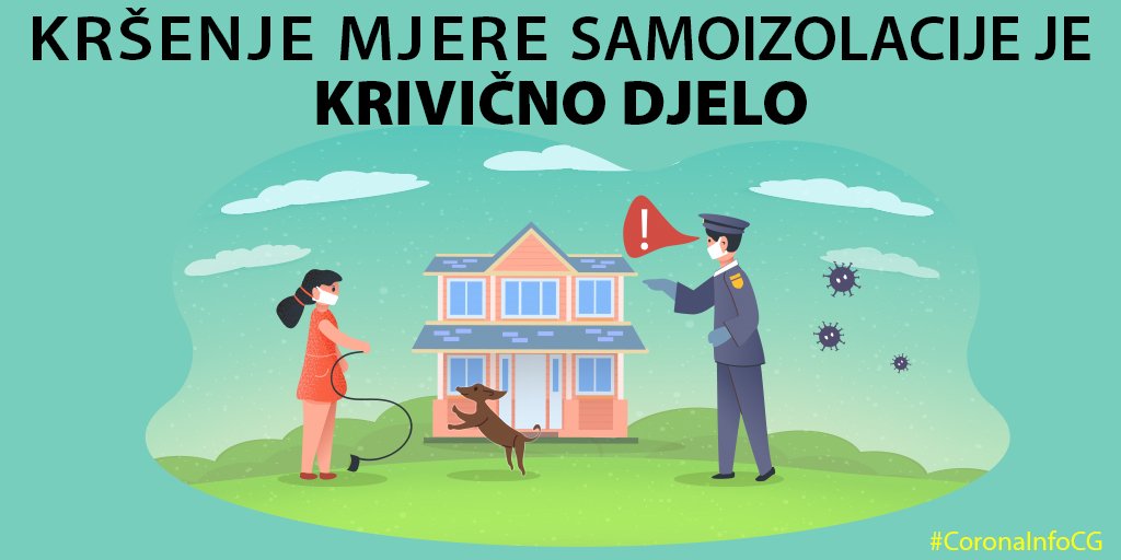 Kršenje samoizolacije kažnjava se novčano ili zatvorom do jedne godine. Ko kršenjem samoizolacije teško naruši nečije zdravlje prijeti mu kazna 1-8 godina zatvora, a ko uzrokuje nečiju smrt 2-12 godina, navodi se na Tviteru Vlade CG. Post navigation U svijetu više od 550.000 žrtava korone Vrijedna donacija Lovćen osiguranja Crvenom krstu