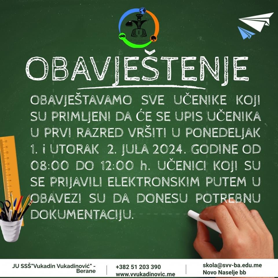 JU Srednja stručna škola “Vukadin Vukadinović” iz Berana obavještava sve učenike koji su primljeni da će se upis u prvi razred vršiti u ponedjeljak, 1. jula i utorak, 2. jula 2024. godine, od 08:00 do 12:00 sati.