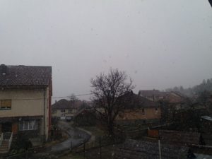 Trenutno u našem gradu oblačan i sniježan dan. Tama je opkolila nebo, a pahulje lete na sve strane.