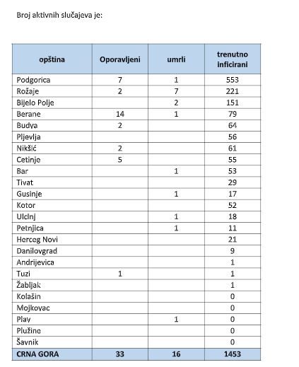 Uzimajući u obzir preminule i oporavljene, broj aktivno oboljelih COVID19 slučajeva u Crnoj Gori trenutno je 1453.