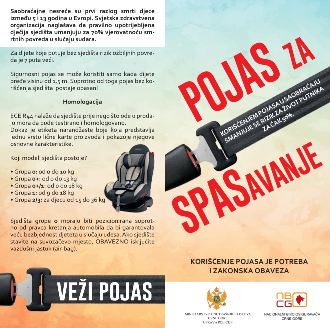 Ističemo da zakonske odredbe preciziraju da svi vozači i putnici u vozilu koje ima fabrički ugrađene sigurnosne pojaseve – ili ima mogućnost njihove ugradnje – moraju koristiti pojaseve. Takođe, propisano je da se djeca do pet godina starosti moraju prevoziti u posebno dizajniranom bezbjednosnom sjedištu, odnosno u korpi čvrsto pričvršćenoj sigurnosnim pojasom ili kopčama unutar vozila, osim ako je riječ o javnom prevozu putnika.