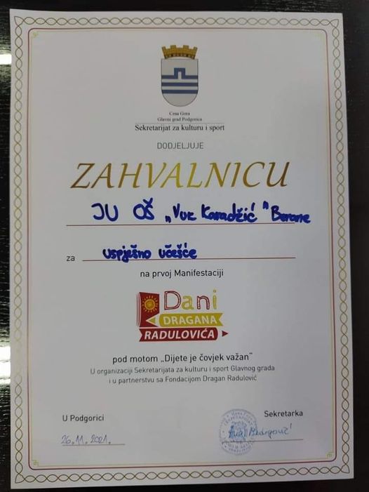 Zahvalnicama za učešće nagradjene su : Jovana Božović ,njen mentor je Mira Šćekić,Katarina Božović čiji je mentor Ljiljana Bogavac i Vladana Gluščević ,njen mentor je Miljana Bubanja.