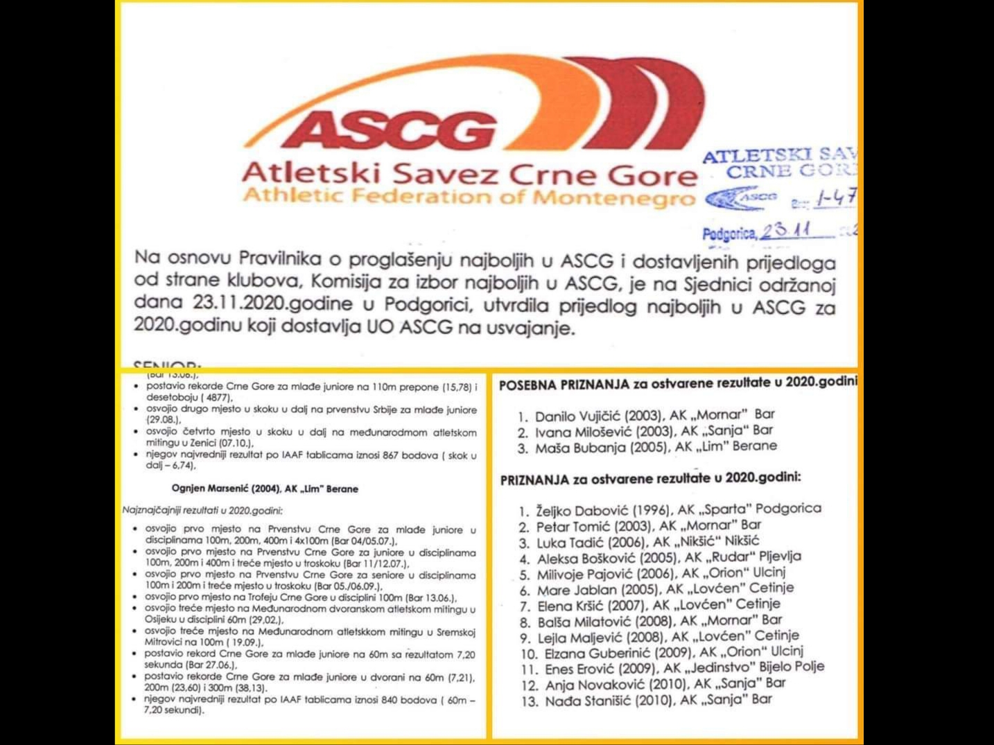 Komisija za izbor najboljih u Atletskom savezu Crne Gore, na sjednici održanoj 23. novembra 2020. godine, utvrdila je prijedlog da za najuspješnijeg mlađeg juniora u 2020. godini proglasi Ognjena Marsenića, člana AK “Lim” i učenika 2-1 odjeljenja beranske Gimnazije, a da posebno priznanje za postignute rezultate u 2020. godini dodijeli Maši Bubanja, takođe članici AK “Lim” i učenici ove škole (odjeljenje 1-4). Prijedlog je dostavljen UO ASCG na usvajanje.