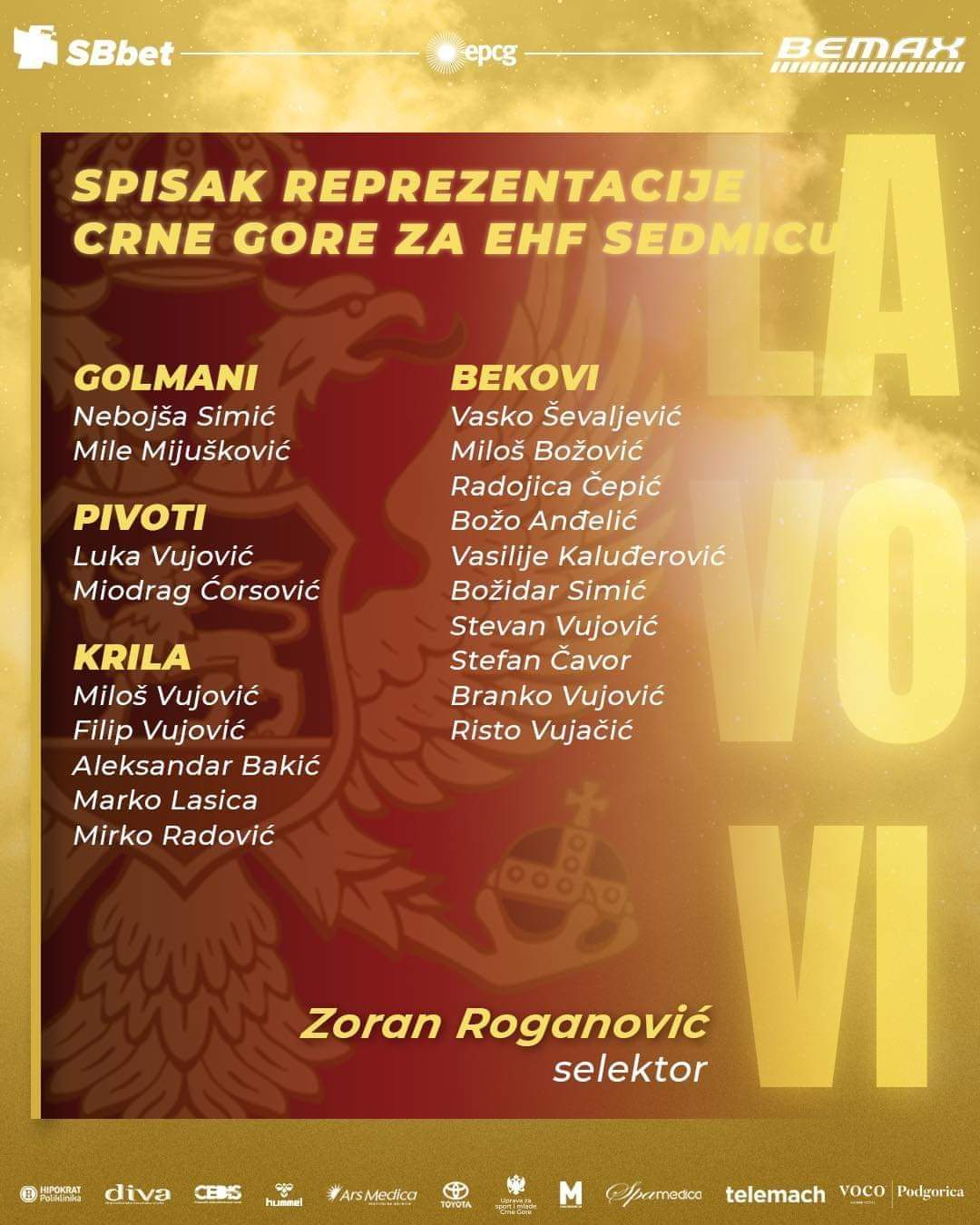 U odnosu na prvenstvo na kojem je ostvaren najveći uspjeh crnogorskog muškog rukometa, zbog povreda, klupskih obaveza ili porodičnih razloga, a sve u dogovoru sa selektorom Roganovićem, u ovoj akciji neće biti golmana Nikole Matovića, te pivota Nemanje Grbovića, Nebojše Simovića i Vuka Lazovića.