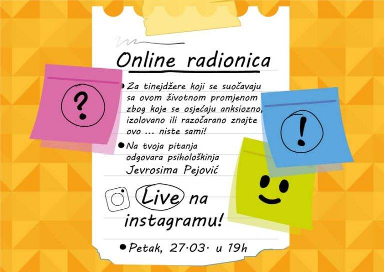 Pored normalnih, razvojnih nesuglasica, sada se borite i sa strahovima roditelja, nastavnika, starijih – svih onih koji tvrde da “znaju bolje i više”. Zato smo odlučili da organizujemo tri Instagram live-a, gdje možeš da čuješ korisne informacije i dobiješ odgovore na pitanja vezana za preživljavanje u izolaciji, sa aspekta mentalnog zdravlja”, navodi se u saopštenju.
