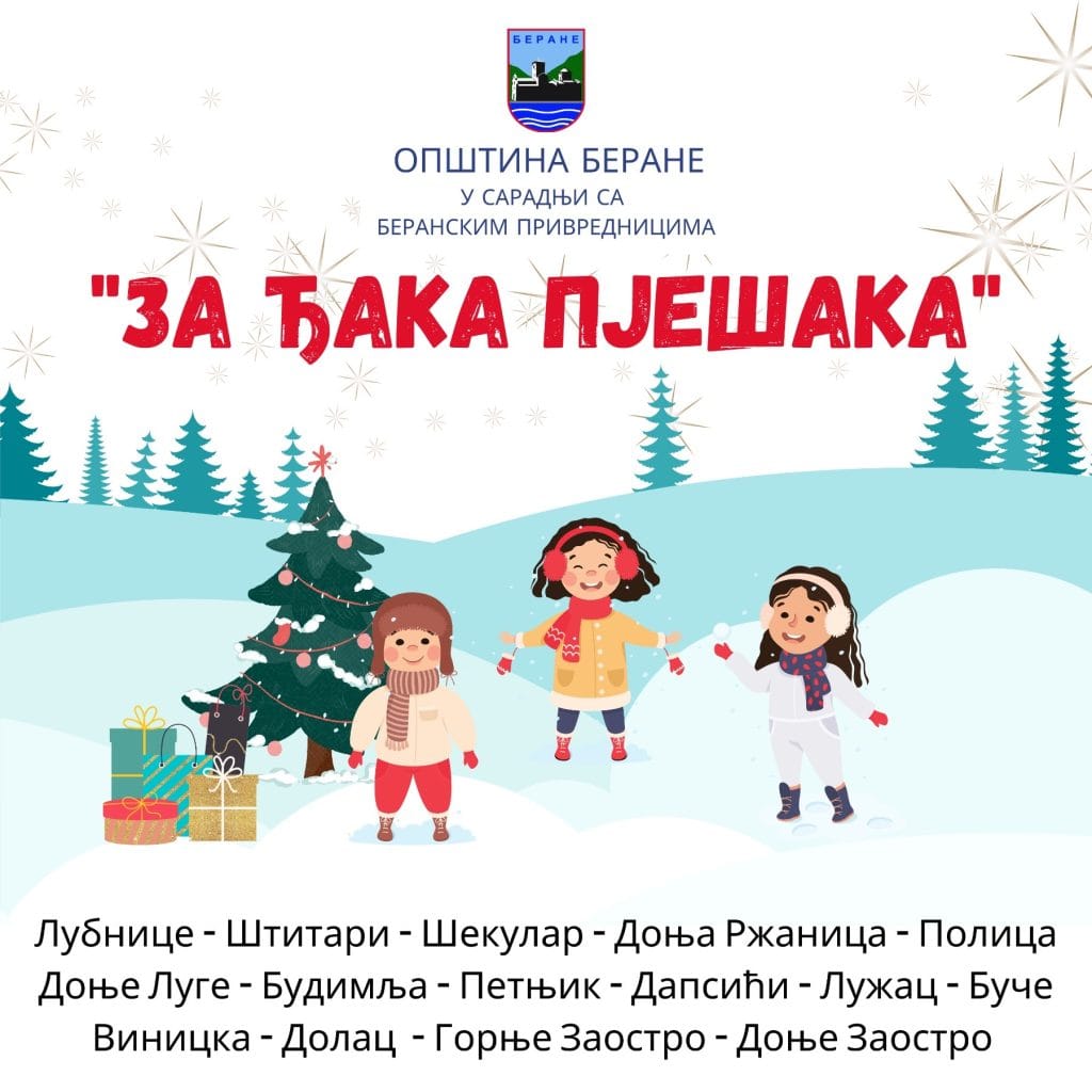 U susret predstojećim praznicima, Opština Berane, sa zadovoljstvom obavještava javnost da će, u partnerstvu sa privrednicima sa teritorije opštine ali i prijateljima koji posluju u drugim crnogorskim gradovima i u Srbiji, obradovati mališane koji pohađaju neku od škola na prigradskom ili seoskom području opštine Berane.