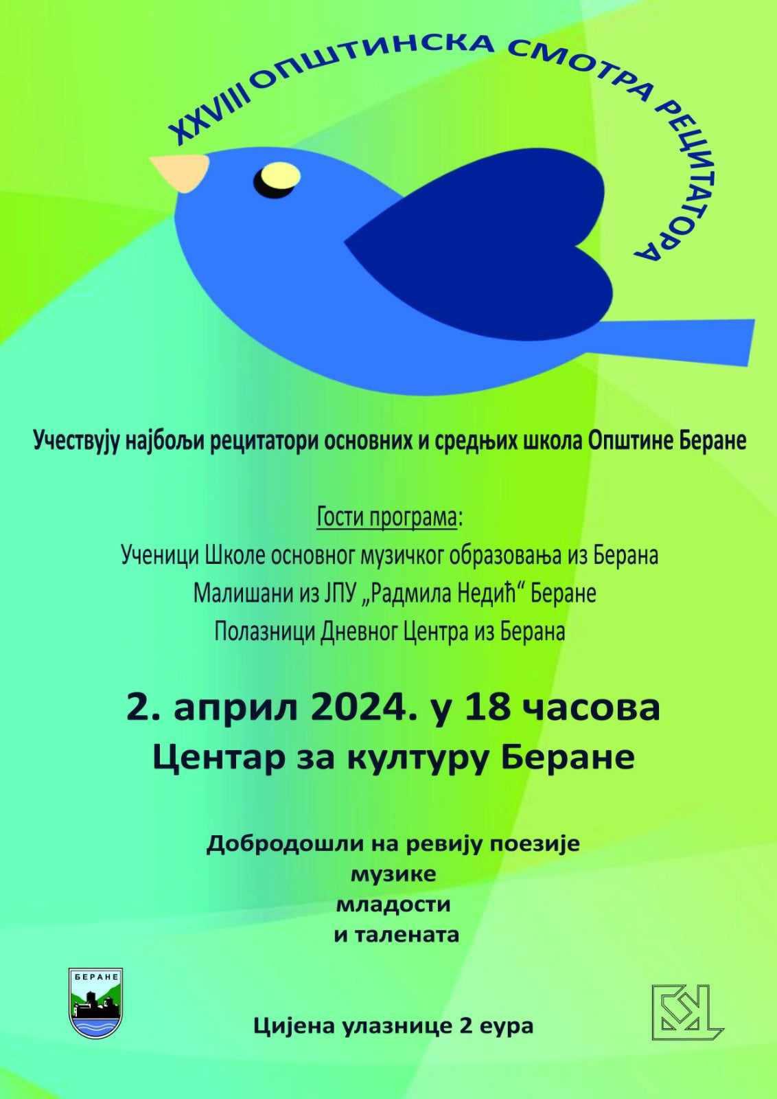 Tradicionalna kulturna manifestacija, XXVIII Opštinska smotra recitatora, biće održana u utorak, 02. aprila 2024. godine u 18 sati u Centru za kulturu u Beranama.