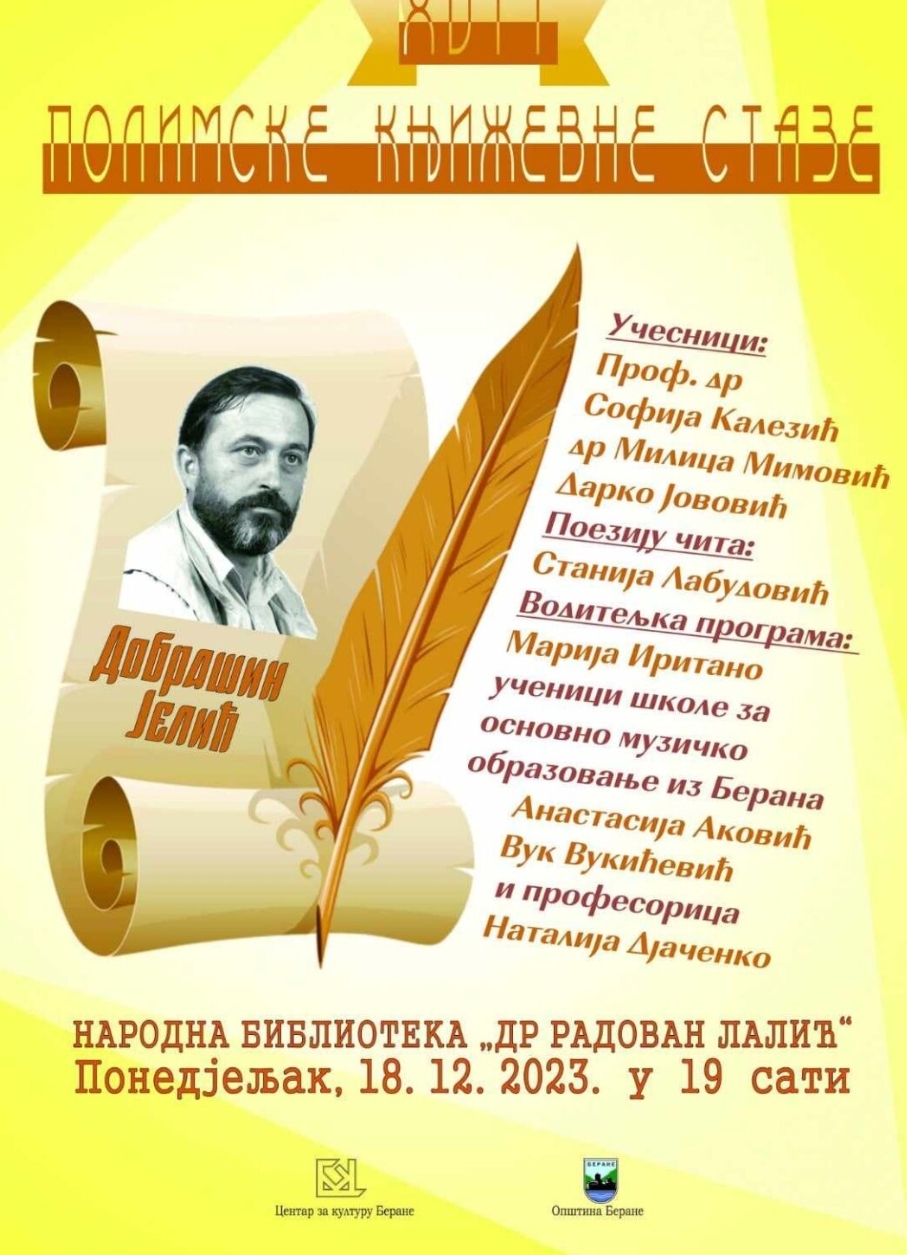 U organizaciji JU Centar za kulturu u ponedjeljak, 18. 12. 2023. godine u 19 sati, u Narodnoj biblioteci „Dr Radovan Lalić“ biće održana tradicionalna kulturna manifestacija „XVII Polimske književne staze“, ovaj put posvećene književniku Dobrašinu Jeliću.