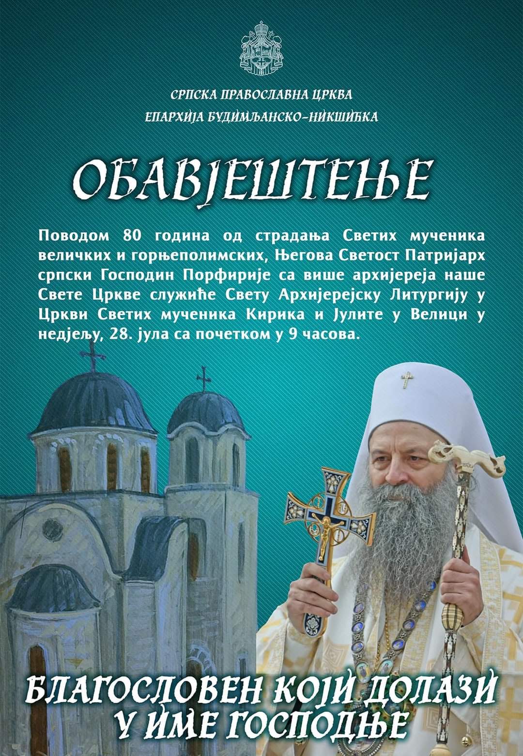Povodom 80 godina od stradanja Svetih mučenika veličkih i gornjepolimskih, Njegova Svetost Patrijarh srpski Gospodin Porfirije sa više arhijereja Svete Crkve služiće Svetu Arhijerejsku Liturgiju u Crkvi Svetih mučenika Kirika i Julite u Velici u nedjelju, 28. jula.
