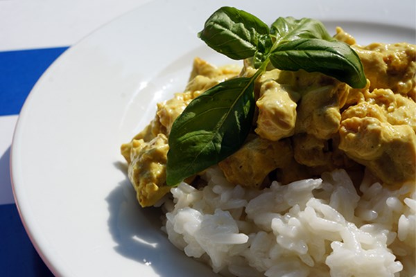 Piletinu najpre posolite, malo pobiberite pa isečete sitno na kockice i stavite da se proprži tri-četiri minuta na već zagrejanom ulju. Dodate zatim u to kari sos, jednu ravnu veliku supenu kašiku i promešajte još nekih dva-tri minuta pa dodate 50 mililitara belog vina i mešajte dok vino ne ispari, a onda stavite isto toliko i vode i mešajte još dva-tri minuta. I na kraju stavite i kuvanu pavlaku i mešajte dok ne provri. Zatim skinete sa šporeta i dodajte još malo soli, ili već sve po ukusu.