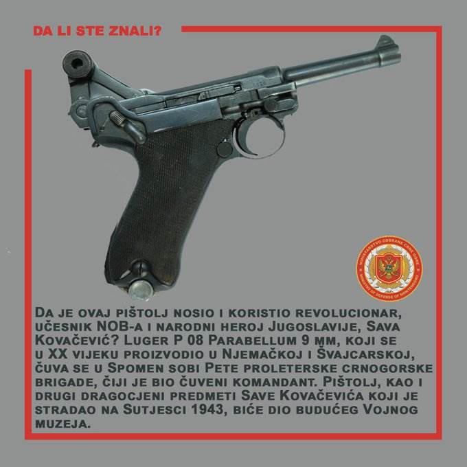 Pištolj revolucionara, učesnika NOB-a i narodnog heroja Save Kovačevića biće dio budućeg Vojnog muzeja, saopšteno je iz Ministarstva odbrane. Kako su naveli, u muzeju će se naći i drugi dragocjeni predmeti narodnog heroja.