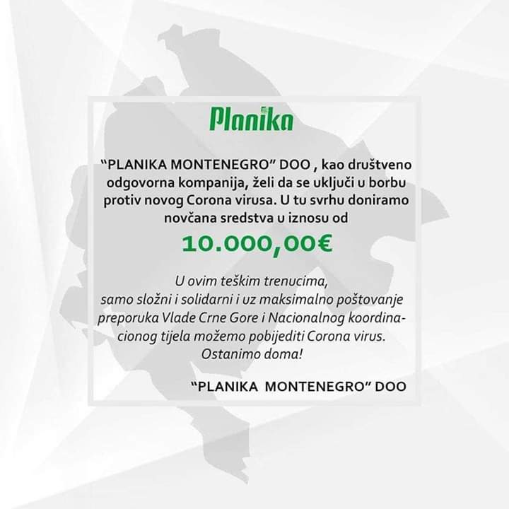 Planika Montenegro doo takođe se uključila donacijom u vrijednosti od 10 000 eura u borbu protiv korona virusa.