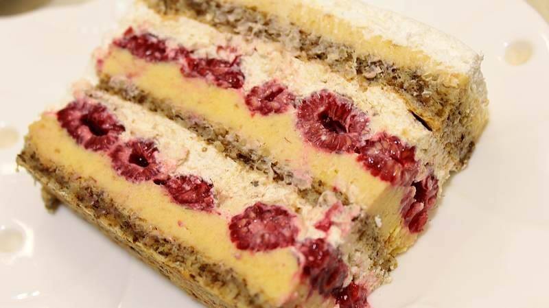 Na koru nanjeti prvi fil, red malina pa drugi fil, druga kora, prvi fil, maline, drugi fil, treća kora. Premazati cijelu tortu ostatkom fila, pa dekorisati po želji. Ostaviti preko noći tortu u frižideru pa sjutradan poslužiti.