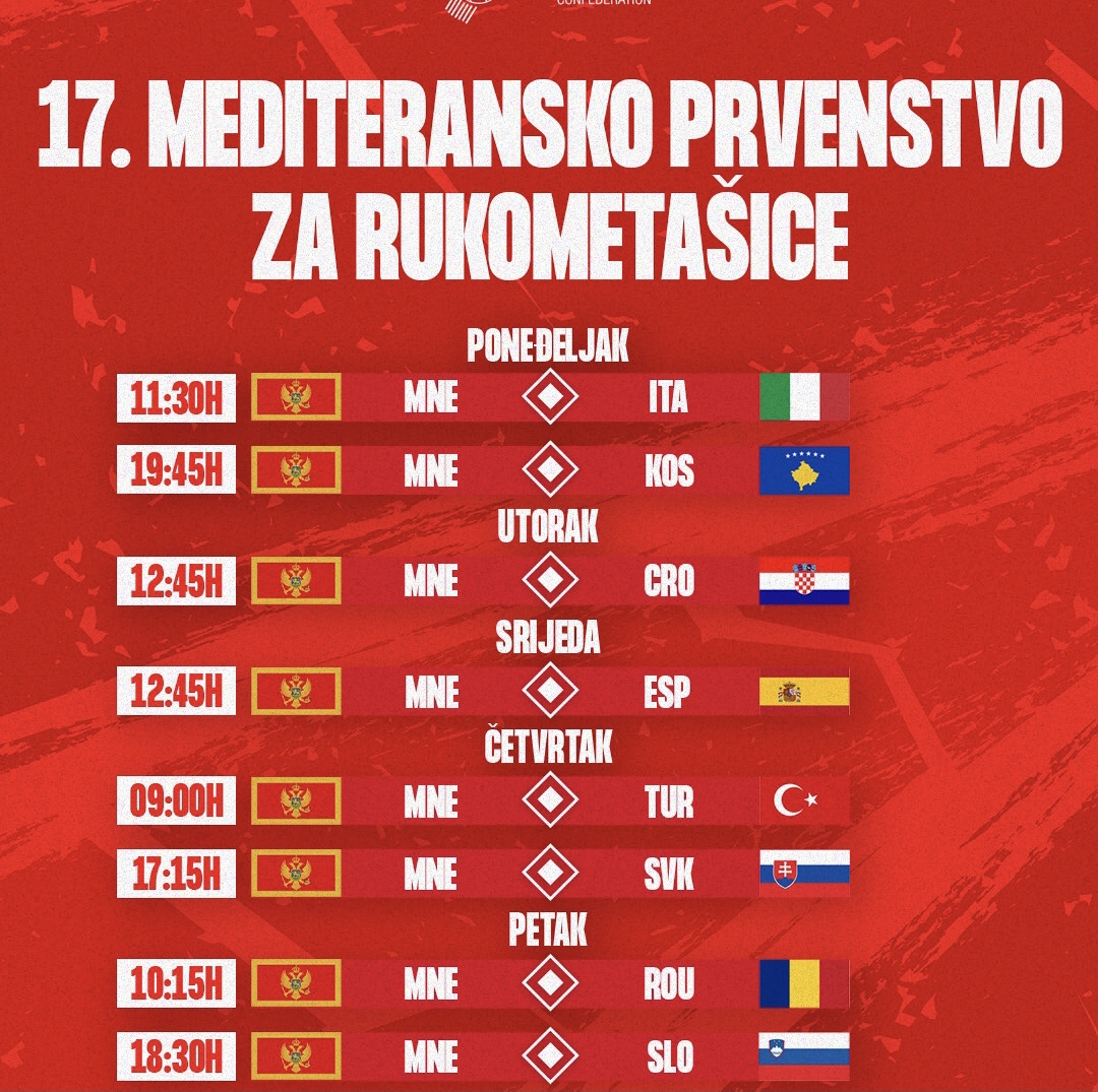 U Podgorici će sjutra biti održano kadetsko Mediteransko prvenstvo za rukometašice do 16 godina, okupivši devet reprezentacija, među kojima su Crna Gora, Hrvatska, Italija, Kosovo, Rumunija, Slovačka, Slovenija, Španija i Turska. Tim će predvoditi treneri Miloš Perović i Bobana Krstović, uz stručnog savjetnika Dobrislava Vujovića i fizioterapeuta Anđelu Kontić Perović.