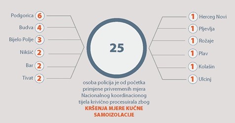 Od početka primjene privremenih mjera Nacionalnog koordinacionog tijela, policija je krivično procesuirala 25 osoba zbog kršenja mjere kućne samoizolacije, navedeno je na tviteru Uprave policije.