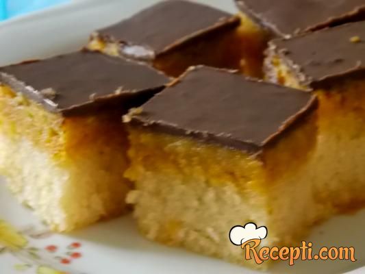 1. Umutiti sok, kisjelu vodu, šećer i ulje. Kada se šećer otopi, dodati brašno kome smo dodali prašak za pecivo. Sve sjediniti u glatku masu bez grudvica. Pleh u obliku pravougaonika podmazati ili obložiti pek papirom i sipati tijesto. Zagrijati rernu na 250 C, pa staviti kolač da se peče, posle 10 minuta, smanjiti temperaturu na 21o C, i peći još dvadesetak minuta.