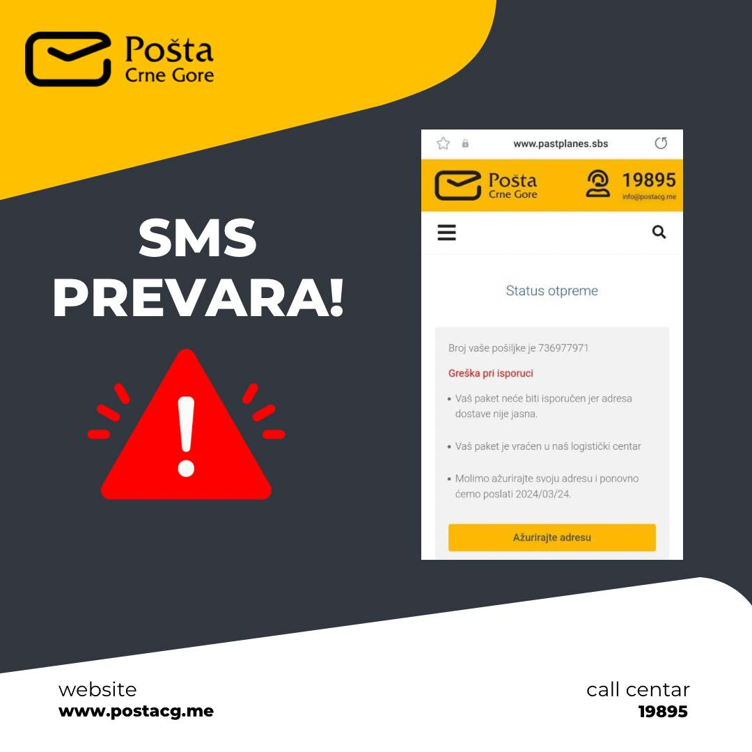 Ukoliko od Pošte Crne Gore primite poruku ili mejl sa krupnim pravopisnim greškama, sadržajem u kojem se miješaju pisma ili jezici, najvjerovatnije je riječ o onlajn prevari. Bez obzira na to šta je sadržaj, provjerite autentičnost mejla ili poruke pozivom Call centra 19895.
