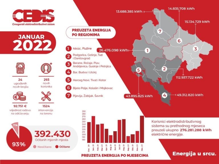 Korisnici elektrodistributivnog sistema su u januaru preuzeli ukupno 276,28 miliona kilovat sati (kWh) električne energije, što je na nivou decembarske potrošnje, saopšteno je iz Crnogorskog elektroprenosnog sistema (CEDIS).