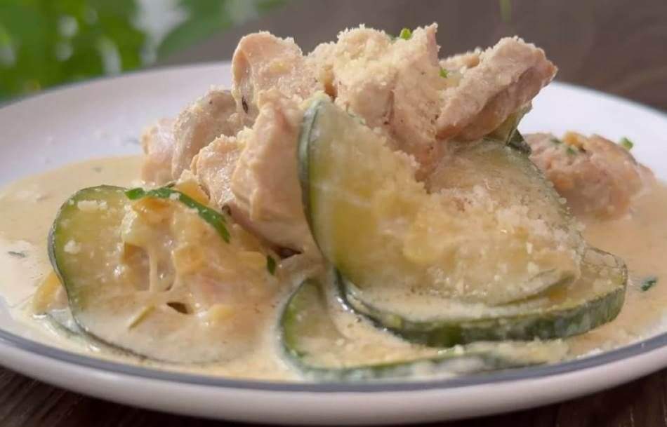 Batake dobro posolite i pobiberite, pa propržite na istopljenom puteru. Izvadite meso, pa u istom tiganju propžite sitno sjeckani crni i beli luk. Kada omekša dodajte tikvicu isječenu na tanke kolutove i promiješajte. Sipajte bujon (može i voda), promiješajte, pa sipajte i vino. Začinite po želji, a kada vino ispari sipajte pavlaku za kuvanje. Dobro promiješajte i vratite meso koje ste isjeckali. Pospite začinima, poklopite i ostavite da se krčka još 15-20 minuta.