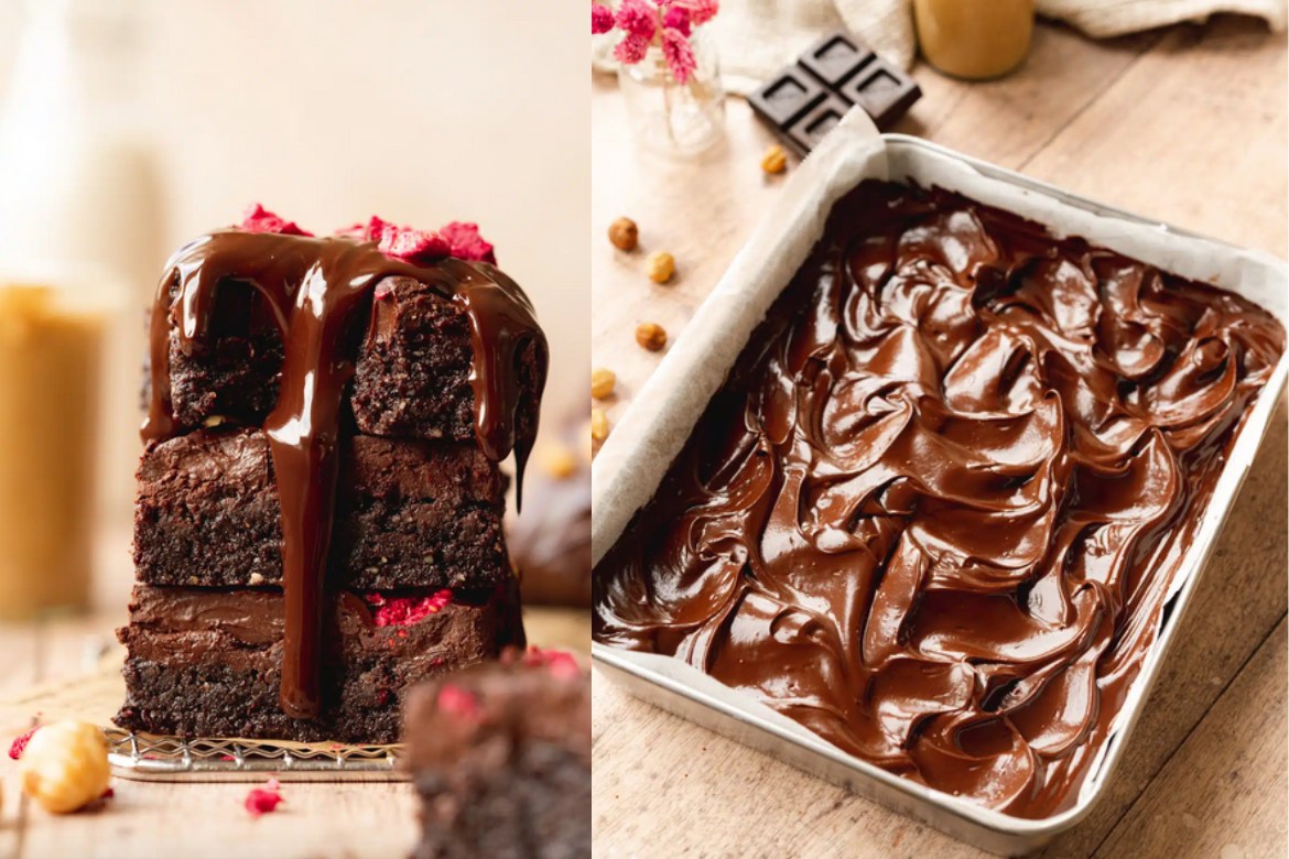 Nanesite glazuru (čokoladni ganache ili neki namaz) na kolač u ravnomjernom sloju koristeći lopaticu. Pospite kolač prženim lješnjacima i malinama ili jagodama. Kolač vrati u frižider na još sat vremena da se ganache stegne, a zatim narežite na pojedinačne kocke.